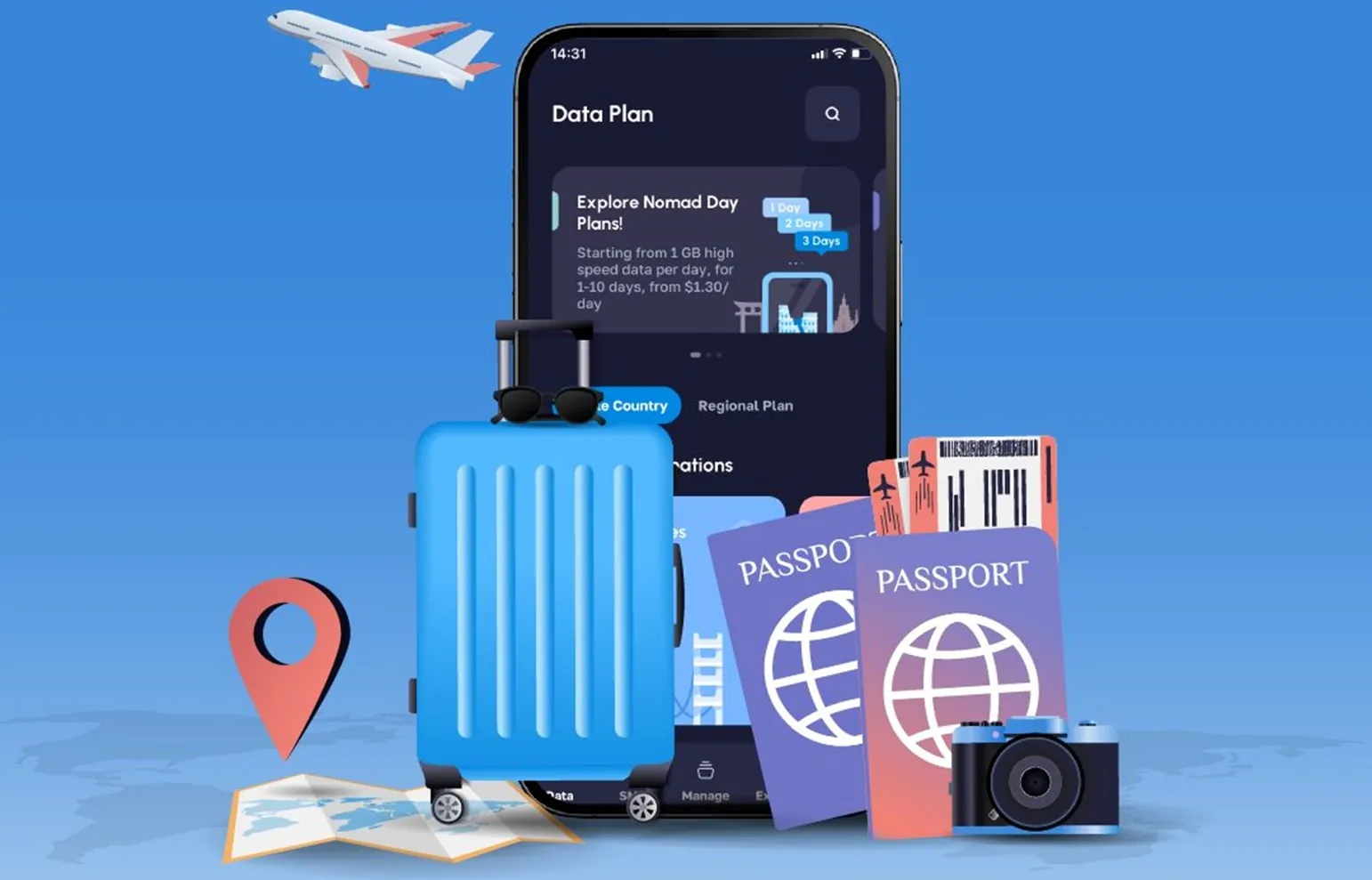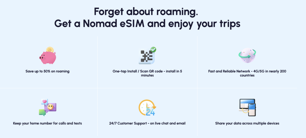 Instead of lining up at airport kiosks or swapping out your SIM, Nomad lets you download an eSIM directly to your phone. In just a few minutes, you’re connected and ready to explore.